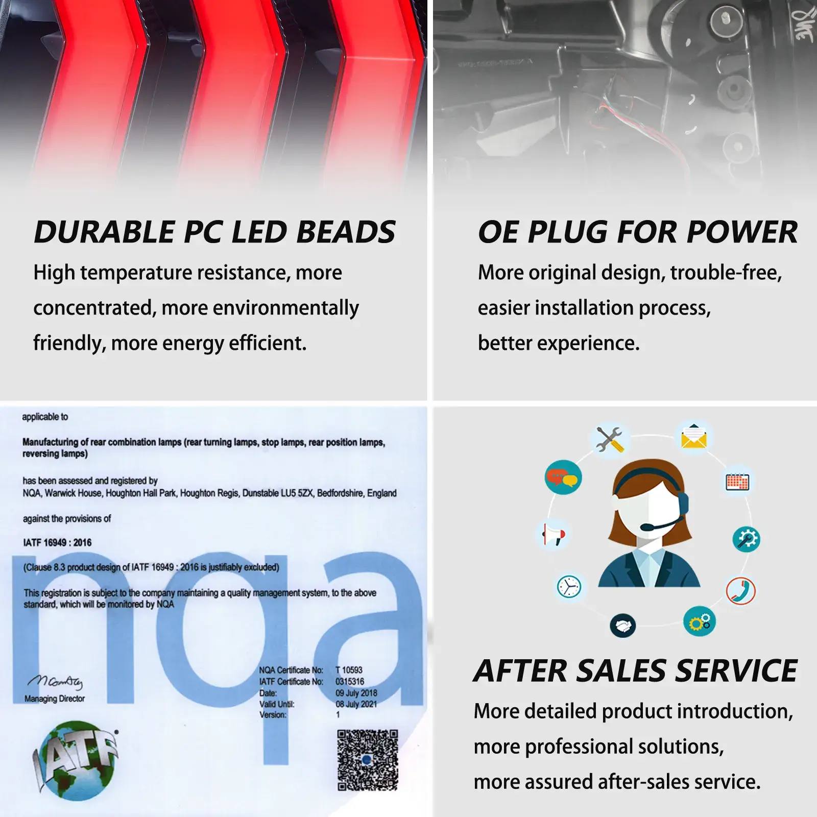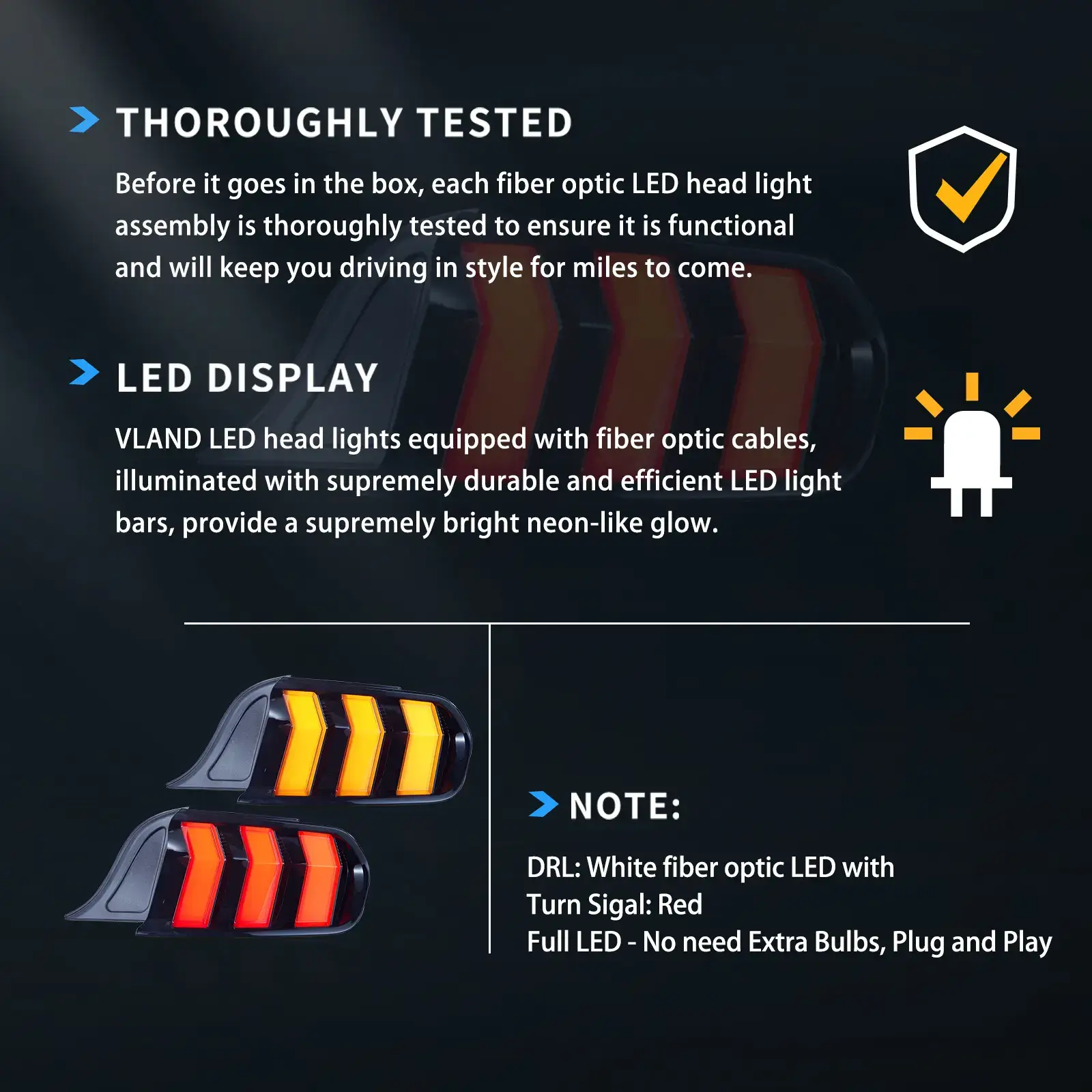 - Išskirtinis „Custom Style“ – stilingi penkių režimų nuoseklūs posūkių žibintai, raudonas LED parkavimo / bėgimo žibintas, stabdžių žibintas. Lempučių NEREIKIA (visiškai LED). Prijunk ir naudok. Suteikia stipresnį, koncentruotą šviesos srautą, palyginti su įprastais galiniais žibintais.
